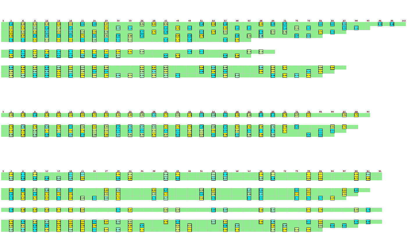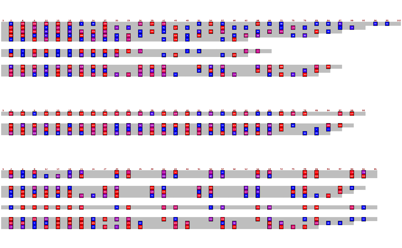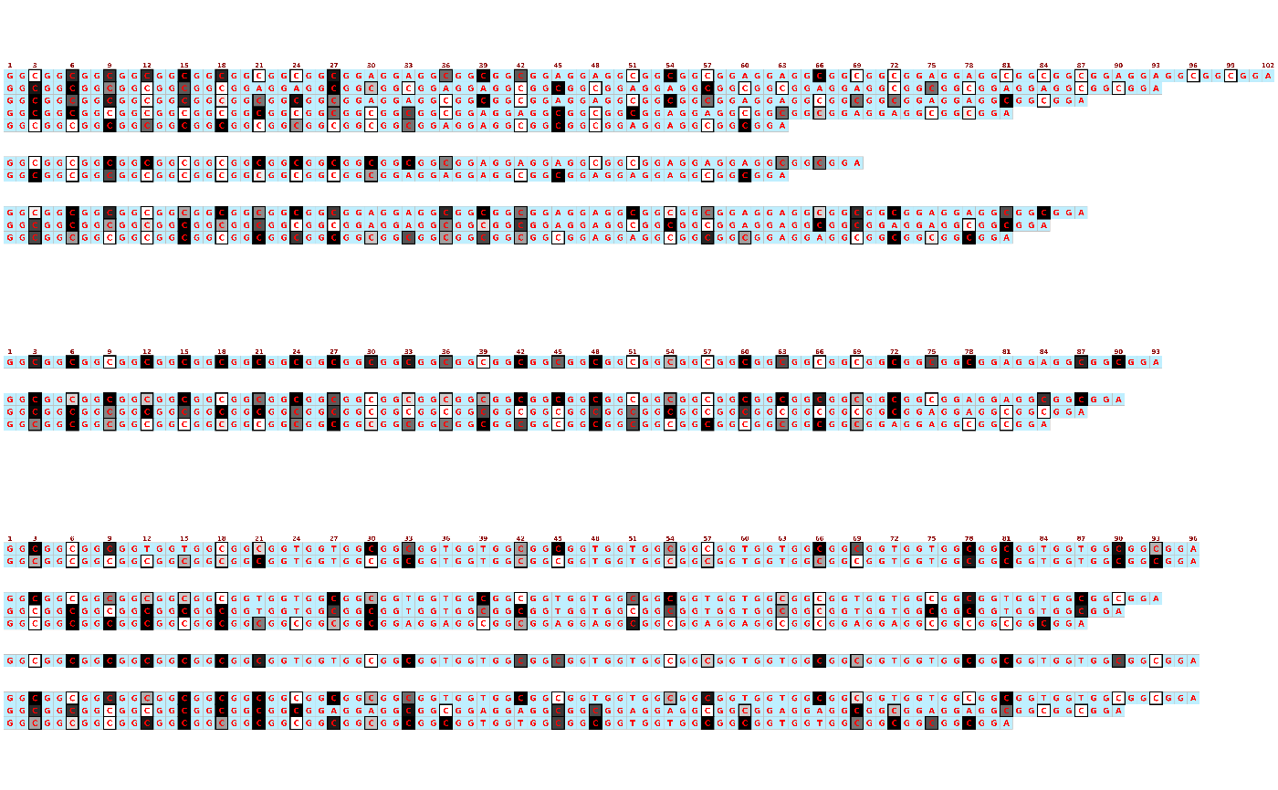 To make the detailed plots with box outlines, sequence text, and index annotations,ggplot2::geom_tile()is used. However,geom_tileis slower for huge datasets, so there is an option to usegeom_rasterinstead.geom_rasterdoes not support box outlines, sequence text, or index annotations, but is much faster if only the colours are wanted.geom_rasteris automatically used if it will not change the plot (i.e. if all extraneous elements are already off), but can be forced using this argument.- render_device