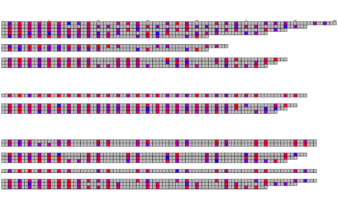 To make the detailed plots with box outlines, sequence text, and index annotations,ggplot2::geom_tile()is used. However,geom_tileis slower for huge datasets, so there is an option to usegeom_rasterinstead.geom_rasterdoes not support box outlines, sequence text, or index annotations, but is much faster if only the colours are wanted.geom_rasteris automatically used if it will not change the plot (i.e. if all extraneous elements are already off), but can be forced using this argument.- render_device